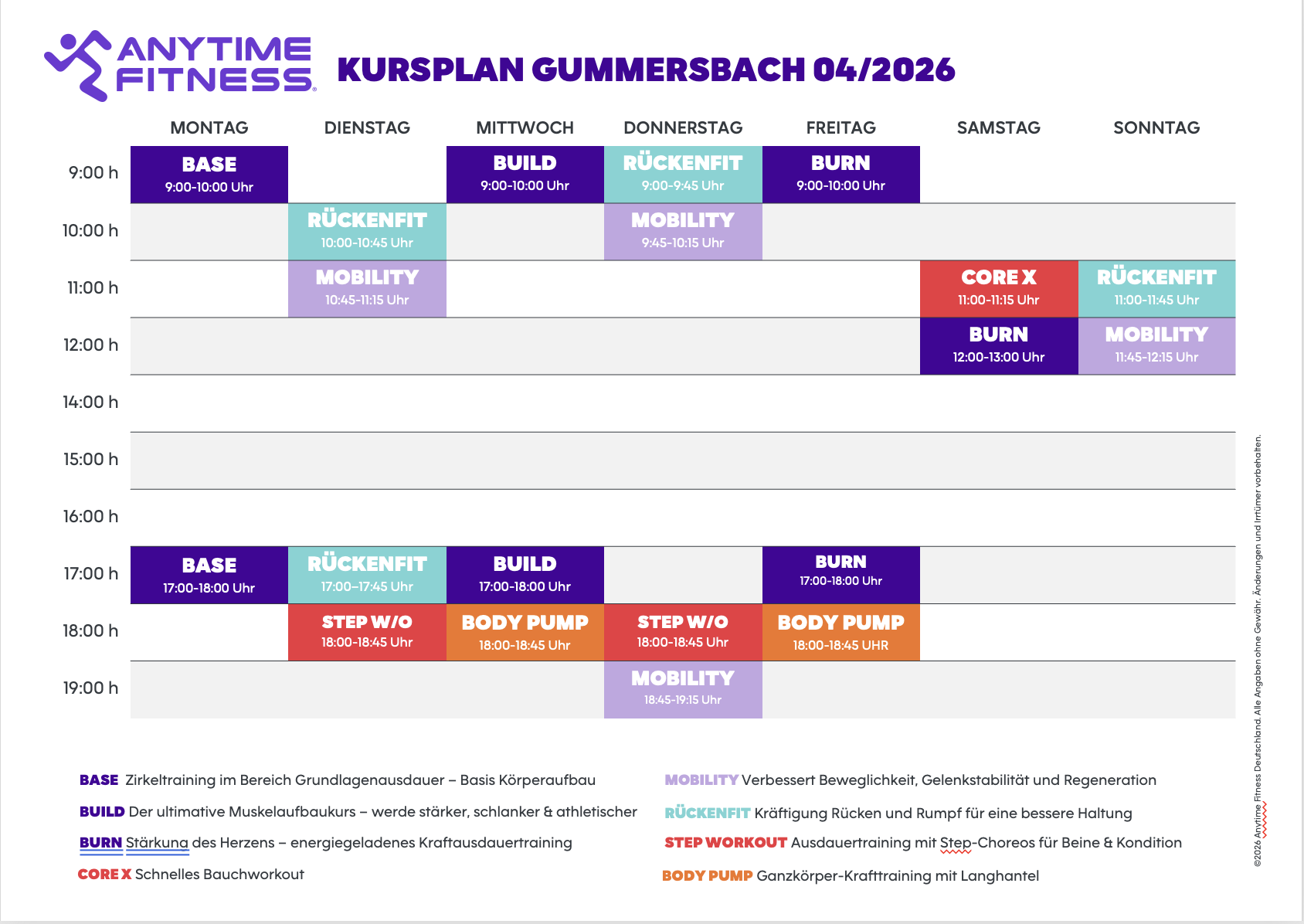 Dein persönlicher Trainingsplan steht am Anfang einer Mitgliedschaft. Ob Geräte, Gewichte, Personal- oder Gruppenfitness, das entscheidet sich anhand Deiner persönlichen Ziele. Wir sind auf alles vorbereitet. Hier siehst Du beispielhaft, was in einer Woche bei uns so los ist.